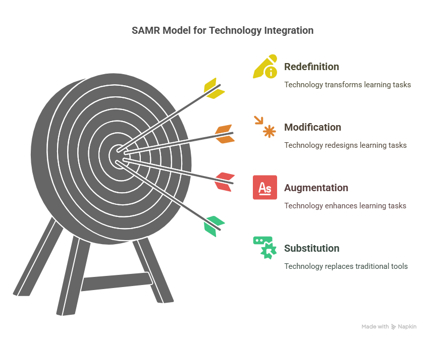 The upper two levels, Modification and Redefinition, represent the Transformation phase. Here, technology becomes an indispensable catalyst for fundamentally redesigning and reconceptualizing learning tasks. The pedagogy itself shifts, enabling new learning experiences that were previously difficult or entirely inconceivable. Following the analogy, this is akin to “creating an entirely new, original dish”. The focus moves from doing old things in new ways to doing new things altogether.